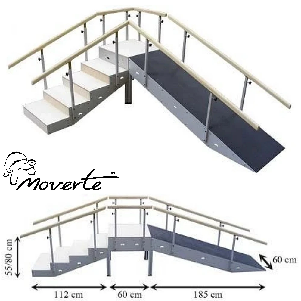 - Se envían 3 módulos: peldaños, descanso y rampa y puede configurarse mediante uniones de acero, bien en ángulo o en línea según las necesidades y es fácil de montar y desmontar.
