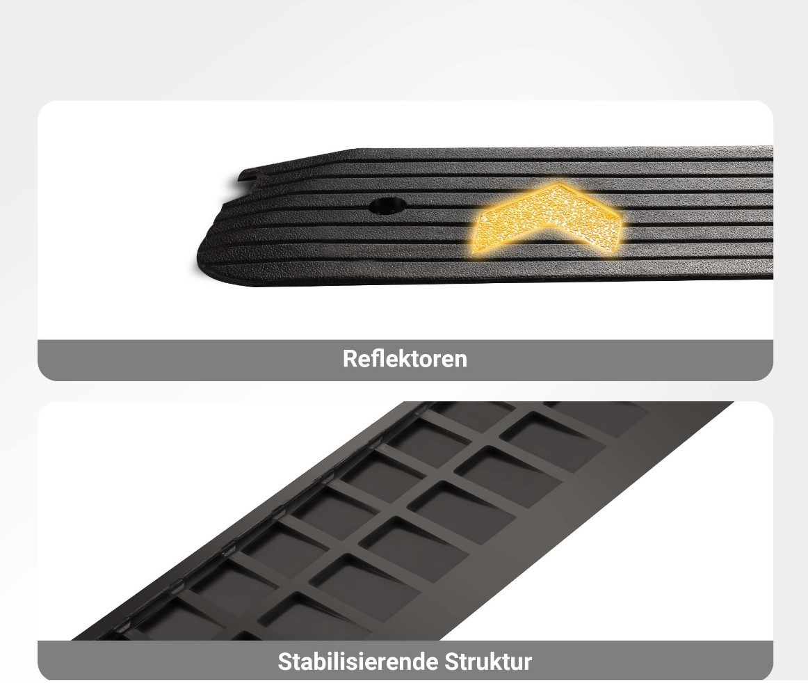 Las cintas reflectoras estratégicamente colocadas en la superficie de la rampa mejoran su visibilidad, especialmente en entornos con poca luz. Esto es clave para su uso en garajes, almacenes y accesos públicos, donde la seguridad es una prioridad.