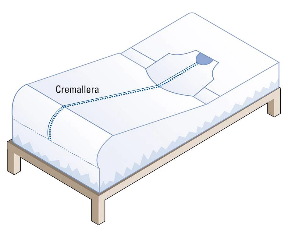 Lleva una goma de ajuste de tensión fuerte que sujeta la sábana bajo el colchón aprovechando el propio peso del paciente.