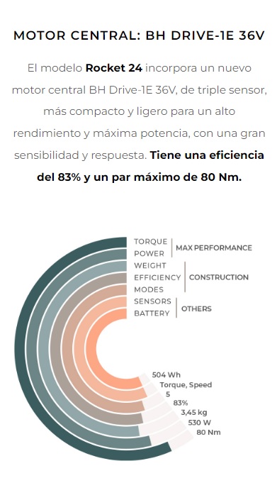 El modelo Monty Rocket 24 incorpora el motor central BH Drive-1E 36V, de triple sensor, más compacto y ligero para un alto rendimiento y máxima potencia, con una gran sensibilidad y respuesta.